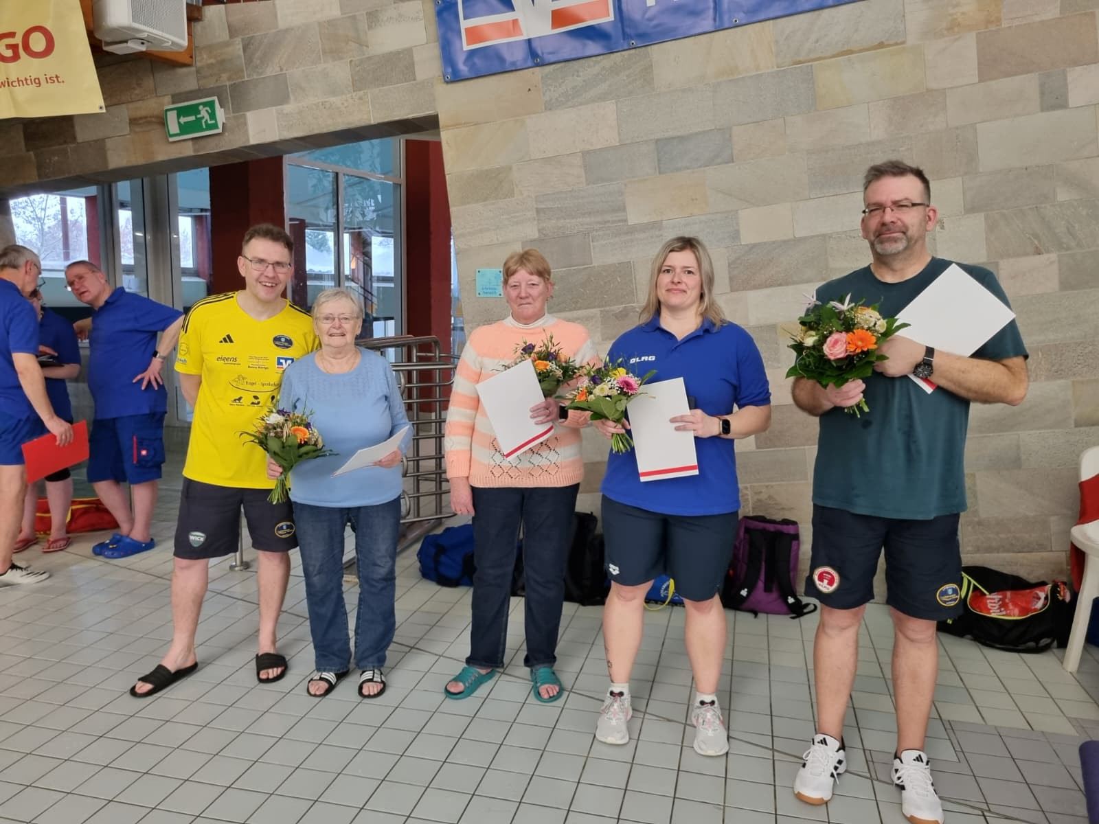 Der Verein nutzte diesen würdigen Rahmen, um langjährige und verdienstvolle Vereinsmitglieder zu ehren. So bekam Mario Bürger das Verdienstabzeichen in Silber, Claudia Müller das goldene Verdienstabzeichen und Monika Ballenthin das Verdienstabzeichen Gold mit Brilliant der DLRG für verdienstvolle Tätigkeiten überreicht. Außerdem bekam Irmlind Winzig die Ehrenmitgliedschaft im Verein der DLRG Luckenwalde für 53 aktive Jahre im Sport verliehen.