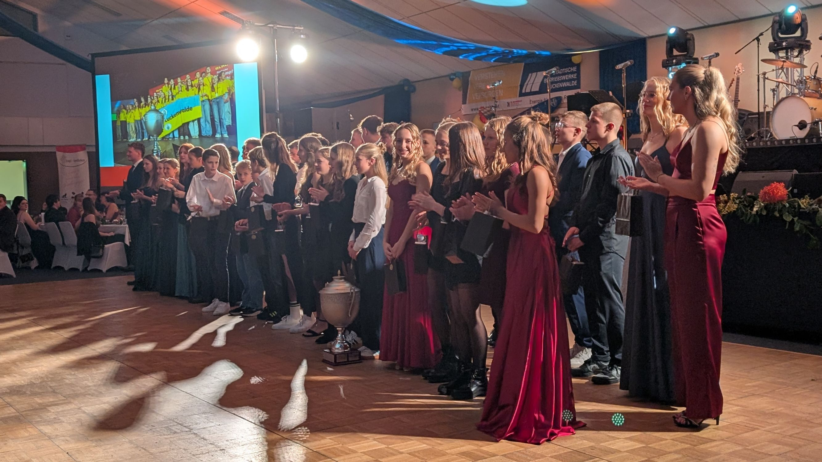 Zunächst ehrte der Vorsitzende Daniel Kuhrmann die sportlichen Erfolge dieses Jahres. Zu den sportlichen Höhepunkten des Jahres 2025 zählen u.a. die 34. Deutsche Seniorenmeisterschaften (DSM) in Bitterfeld-Wolfen, die 6. Internationalen Deutsche Einzelstrecken-Meisterschaften (DEM) in Mönchengladbach, die World Games in Chengdu (China), die (Junioren-) Europameisterschaften in Stettin und Misdroy (Polen) und die 52. Deutsche Mehrkampf-Meisterschaften (DMM) in Hannover. Besonders hervorzuheben ist, dass es bei DMM gelang, den Titel als bester deutscher Verein zu verteidigen. Als alle Sportler vorne standen, wurde jedem im Saal bewusst, dass hier eine Menge Arbeit hinter steckt seitens der Sportler oder aber auch der Trainer, Betreuer und Eltern. All diese Erfolge wären ohne die Unterstützung der Fläming-Therme und der Stadt Luckenwalde nicht möglich, da so sehr gute Trainingsbedingungen existieren.